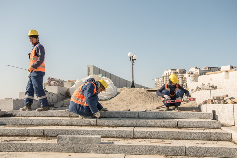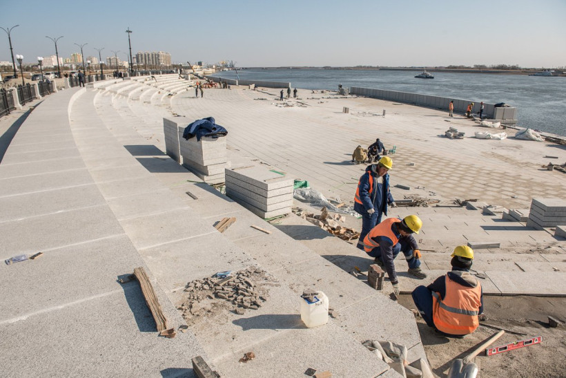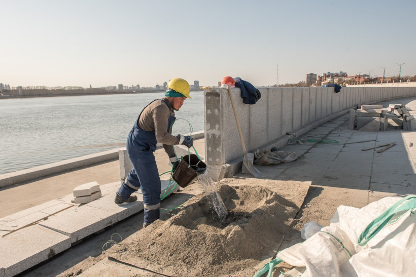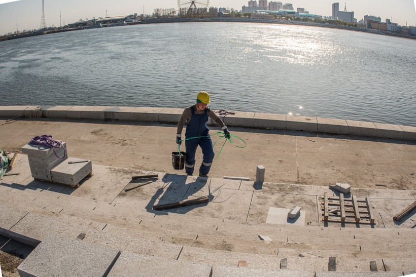 Почти вся набережная уже одета в гранит, основные работы сосредоточены на последнем участке. Здесь строители продолжают облицовку амфитеатра, в том числе монтируют блоки темно-серого и красного гранита на сцене. По задумке проектировщиков, разноцветные плиты складываются в определенный узор, но сейчас под слоем строительной пыли его почти невозможно разглядеть. «Когда закончим все работы, мы сделаем уборку и все будет видно», — успокаивает Денис Рябухин.