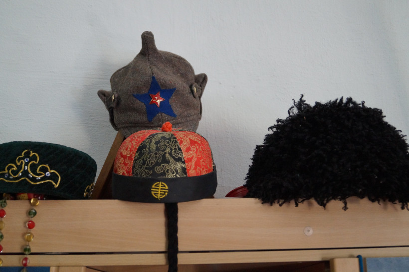 Отдельное почетное место в кабинете мастера — для собственноручно сшитых головных уборов. На полке тюбетейки, буденовки, китайские шапочки.