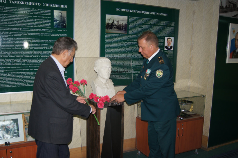 В пятницу, 25 октября, благовещенские таможенники почтили память своего коллеги Василия Дымчука, зверски убитого контрабандистами в начале XX века. В День таможенника Российской Федерации к бюсту Василия Тарасовича возложили цветы начальник Благовещенской таможни Михаил Сорокин и председатель ветеранской организации Евгений Курочкин. Чтить память старшего таможенного досмотрщика Василия Дымчука, отважно боровшегося в Приамурье с контрабандистами-спиртоносами — ежегодная традиция.