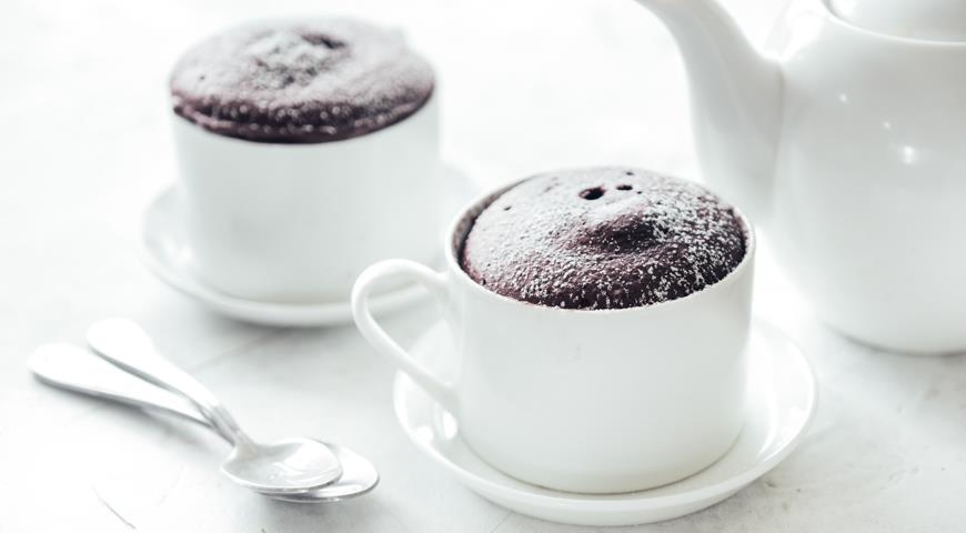 Смешайте муку, какао, сахар, разрыхлитель и соль. Добавьте молоко и масло, смешайте блендером до однородности. Возьмите широкую керамическую чашку, подходящую для микроволновки, и наполните ее четвертью получившейся смеси. Шоколад разломайте на крупные ломтики и утопите их ложкой в тесте в центре чашки. Затем закройте тестом и разровняйте. Выпекайте фондан в СВЧ-печи на самой высокой мощности около 1 мин. Но лучше сначала поставьте время 40 сек. и проверьте готовность, а лишь потом допеките при необходимости, поскольку если передержать фондан в печи, у него не будет жидкой сердцевинки. Подавайте немедленно.