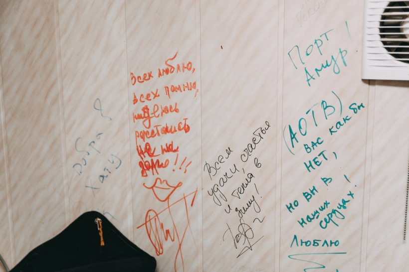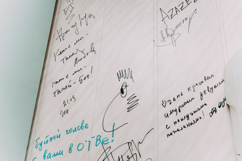 Одно из самых маленьких, но при этом дорогих помещений — операторская. Здесь располагается много шкафчиков, в которых хранятся камеры. Каждая из них именная, записана на конкретного оператора и запирается на ключ. Раньше эта комната была гримерной, о чем свидетельствуют множественные надписи на стенах. Такие памятные «приветы» оставляли коллективу гости эфира телекомпании разных лет. Мы разглядели послания от Оксаны Сташенко, Эвклида Кюрдзидиса, группы Azazello. Но большинство визитеров остались неопознанными, потому что оставляли лишь автографы.