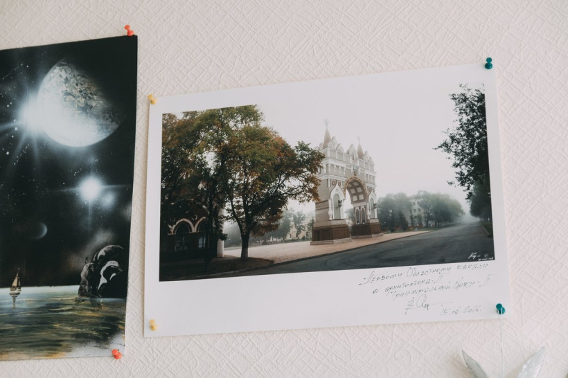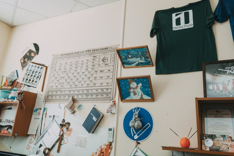 Затрудняюсь ответить, что в ней запомнилось больше всего. Здесь все прекрасно: развешанные по стенам старые пленочные кассеты, гирлянды жестяных банок из-под колы, виниловые пластинки Queen и Beatles и даже прибитый к обоям резиновый тапок, соседствующий с дипломами и благодарностями в рамках. Словно побывал на выставке современного искусства. Стало очевидно, что за смущенными улыбками, немногословностью и просьбой не фотографировать скрываются творческие натуры. Иначе быть не может. Но главная гордость мужского кабинета — вечно зеленый и цветущий подоконник.