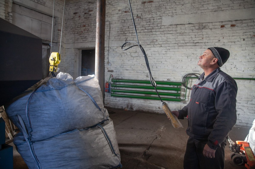 Два новых терморобота блестят серебряными боками. Рядом — мешки с углем. «Раньше трактор приезжал, через окно в угол ссыпал уголь, оттуда уже лопатами кидали в печку. Теперь вот так!» — машинист котельной Владимир Савченко нажимает на кнопку пульта, и кран начинает поднимать мешок с углем к воронке котла. Затем остается только развязать горло мешка — и топливо оказывается внутри «Прометея». 500—700- килограммовые мешки с топливом подвозят на площадку, где их подцепит крюк, с помощью специальной тележки. Теперь лопата нужна только в конце смены — один раз убрать золу.