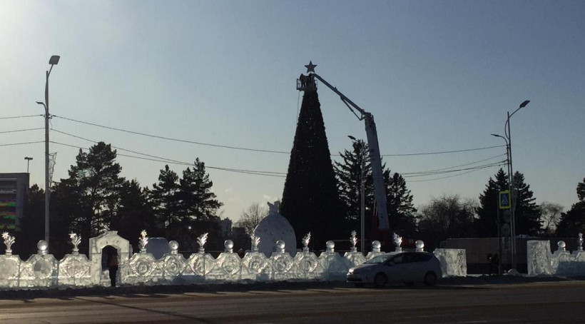 На площади Ленина в Благовещенске началась установка главной новогодней елки города. Уже много лет — это ель высотой 22 метра. Верхушку искусственного дерева украсит звезда с размахом лучей 1,5 метра.