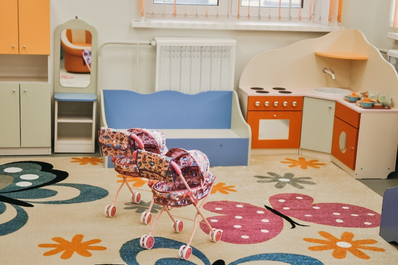 В групповых помещениях есть мягкие диваны, сухие бассейны, куклы для девочек и машинки для мальчиков, конструкторы, игрушечные поезда, игровая кухонная зона, спальня и зал.