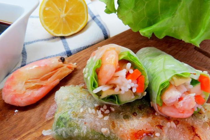 Спринг-роллы — одно из традиционных новогодних угощений. Размораживаем креветки, очищаем от панцирей, удаляем голову. Солим и перчим. Готовим чесночное масло: в кипящее масло кладем очищенные зубчики чеснока, раздавленные плоской стороной ножа. Обжариваем пару минут, затем чеснок удаляем. В кипящем чесночном масле обжариваем креветки в течение 1—2 минут. Подготавливаем овощную начинку: авокадо, огурец и морковь нарезаем тонкими полосками. Листья салата моем и обсушиваем на полотенце. Нарезанный авокадо сбрызгиваем соком лимона. Рисовую лапшу отвариваем согласно инструкции на упаковке. Один рисовый блинчик кладем на разделочную доску, наливаем на него 2 ст. л. воды, распределяем воду руками по всему блинчику — он смягчится. В центр кладем лист салата, на него — полоски моркови, огурца и авокадо. Поверх овощей — рисовую лапшу. Сверху выкладываем чесночные креветки. Начинаем заворачивать блинчик снизу, затем накрываем середину боковыми частями и туго скручиваем ролл. Спринг-роллы можно есть без обжарки, можно обжарить во фритюре до золотистого цвета, а можно слегка подрумянить на чесночном масле, которое осталось от обжарки креветок. Все варианты по‑своему вкусны. При обжарке важно, чтобы рисовая бумага не была порвана, а ролл — герметично скручен. Подают спринг-роллы с соевым соусом.