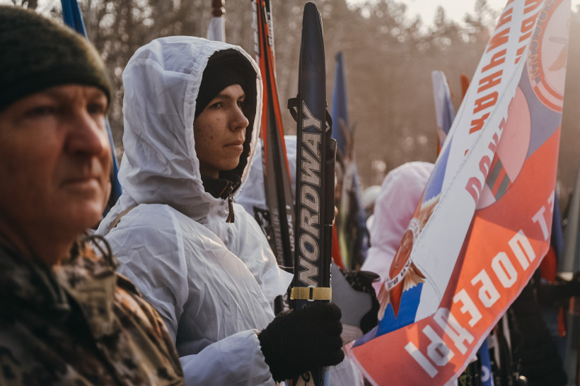 На площади Победы села Тамбовка в стройные ряды выстроились лыжники в белых маскировочных костюмах с флагами в руках. Здесь под гимн Российской Федерации прошло торжественное открытие мероприятия. Ребята из местных военно-патриотических клубов «Сокол», «Шторм» и «Барс» возложили цветы к памятнику войнов-амурцев. Среди девяти смелых лыжников один выделяется ярким цветным костюмом под маскхалатом. «Это очень волнительно», — признается единственная девушка в строю парней семиклассница Алина Керчева, которая выходит на «Пограничную тропу» впервые.