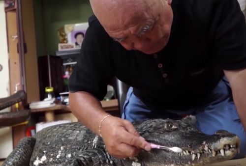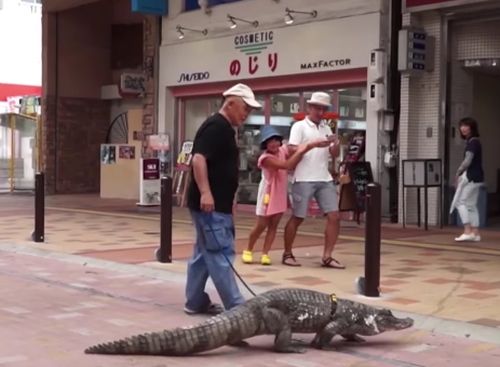 Большинство людей, желающих завести домашнее животное, довольствуются кошками и собаками. Но этот японец пошёл дальше, ведь его домашний любимец — двухметровый кайман. 65-летнего Нобумицу Мурабаяши из города Куре частенько можно увидеть на улице, где он выгуливает крокодила на поводке, не обращая внимания на любопытство и замешательство прохожих.