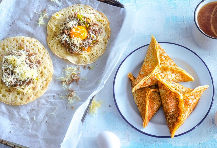 Блины сам по себе — блюдо простое. Но можно поэкспериментировать с начинкой или с формой и оригинально завернуть, например, в виде треугольника. В теплом молоке растворите дрожжи, добавив сахар. Оставьте на 8—10 мин. Добавьте минералку комнатной температуры, просеянную муку и разрыхлитель. Перемешайте тесто. Дайте постоять в тепле 15—20 мин. Выпекайте блинчики на разогретой сковороде, смазанной растительным маслом. Жарьте их только с одной стороны. Другая должна за счет тепла сковороды только чуть подсохнуть. Готовые блинчики не кладите стопкой — разложите в один слой, чтобы не слиплись. Для начинки обжарьте на растительном масле фарш, 10 мин. Добавьте порезанный колечками лук-порей и жарьте до полной готовности фарша. Посолите. Снимите с огня и немного остудите. На каждый блинчик положите немного начинки и тертого сыра, в центр разбейте яйцо. Мысленно разделите блинчики на три части, проведя три линии от центра. Защипните края в одной части почти до середины, затем во второй и третьей. У вас получится «пирожок» с тремя швами. Подготовьте так все блинчики. Переложите их на противень, застеленный бумагой для выпечки, и подпеките в духовке при 180 град. 6—10 мин.