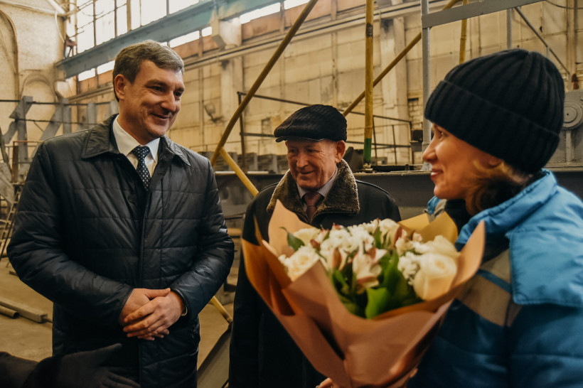 Василий Орлов подарил цветы в честь 8 Марта строительницам кораблей