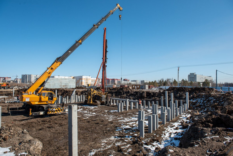 —По всему полю нужно забить 2,5 тысячи свай. Потому что условия этой площадки сложные, она обводнена, на территории два озера. Мы с вами как раз стоим на одном из них: лед добыли, вывезли, отсыпали. По нами 1,5 метра насыпного грунта. Наша задача – быстрее выйти из земли, подняться выше нуля. Будем надеяться, что сделаем это до апреля, до полной оттайки грунтовых вод, — комментирует директор «Строительной компании № 1» Константин Ельцов.