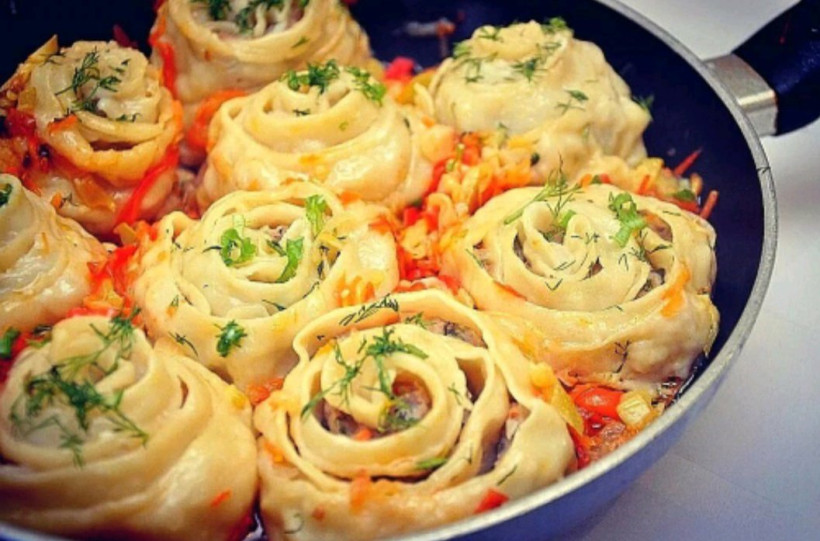 Раскатайте тесто в тонкий пласт. Сверху выложите тонким ровным слоем начинку. Сверните рулетиком. Порежьте его на кусочки толщиной 2 см. Плотно уложите их срезом вниз на сковороду, смазанную растительным маслом. Жарьте по 4 минуты с каждой стороны среза на большом огне. После добавьте 150 граммов воды или бульона и тушите под крышкой до готовности.