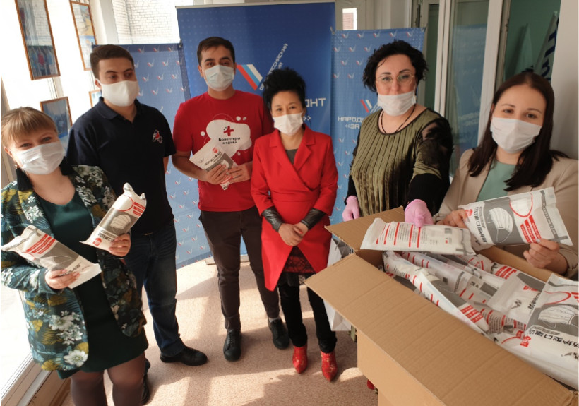 Встреча с активистами Народного фронта прошла в пятницу, 3 апреля. Гости привезли несколько больших коробок — в сумме 5,8 тысячи масок. Бизнес-леди активисты в знак благодарности посвятили в свои ряды, и китаянка быстро сменила красный костюм на фирменную куртку ОНФ.