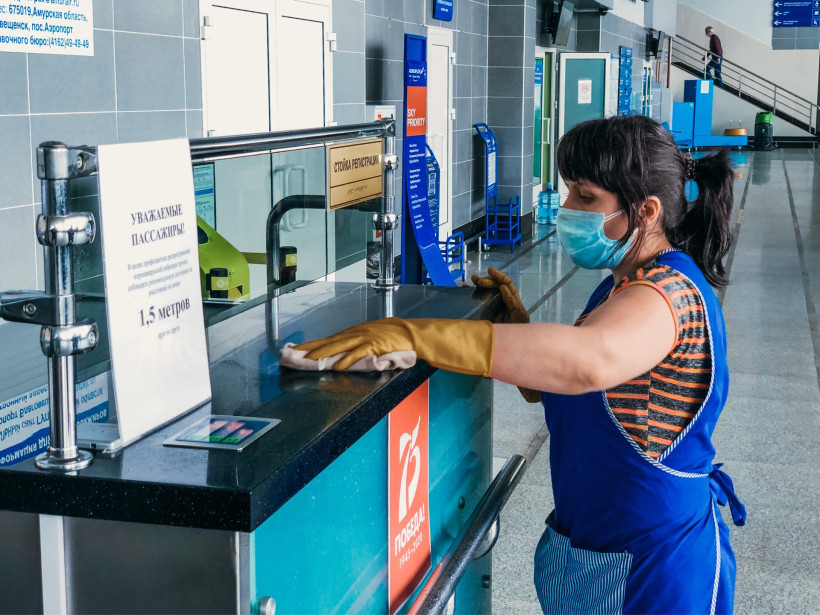 — Обрабатываем специальным раствором все сидения, ручки, поручни, все, чего касается человек, а также амбулифты, туалетные комнаты, перронные автобусы, инвалидные коляски и другое, — рассказал Валерий Оттович. — Также после каждого рейса специальными установками обрабатываются помещение выдачи багажа и помещение, которое используется прилетевшими пассажирами. Кроме того, есть договор с центром гигиены и эпидемиологии Амурской области, которое проводит раз в неделю дезинфекцию своими силами и средствами.