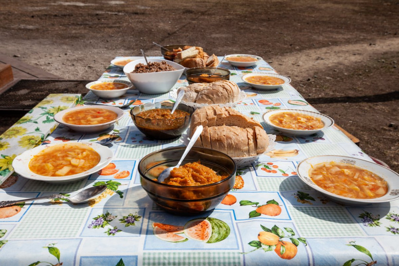 Все столы в трапезной заняты пасхами и куличами, поэтому сегодня обед на улице. Фото: Владимир Воропаев.