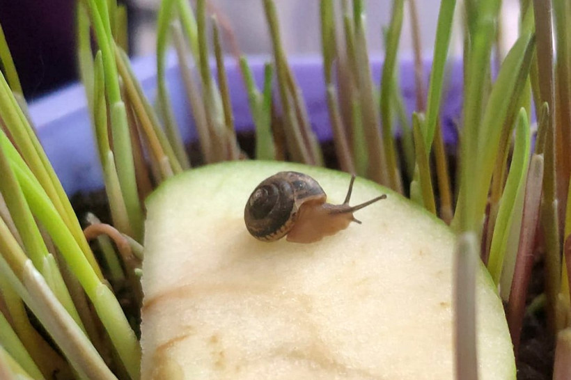 Создала для улитки из подручных средств террариум. Кормлю ее фруктами и овощами, каждый день меняю корм. Выращиваю специально траву, чтобы улитке было комфортно жить. Интересно, что из всех овощей и фруктов она больше любит зеленые яблоки, на которых, наверное, и приехала в Благовещенск.