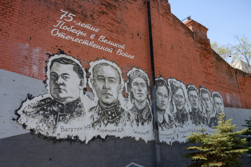 «Стена памяти» объединила портреты восьми участников Великой Отечественной войны, среди них Николай Федорович Ватутин, Дмитрий Михайлович Карбышев, Николай Францевич Гастелло, Зоя Анатольевна Космодемьянская, Назар Ксенофонтович Приходько, Григорий Яковлевич Воропаев, Степан Григорьевич Борисенко и Илья Макарович Каплунов.