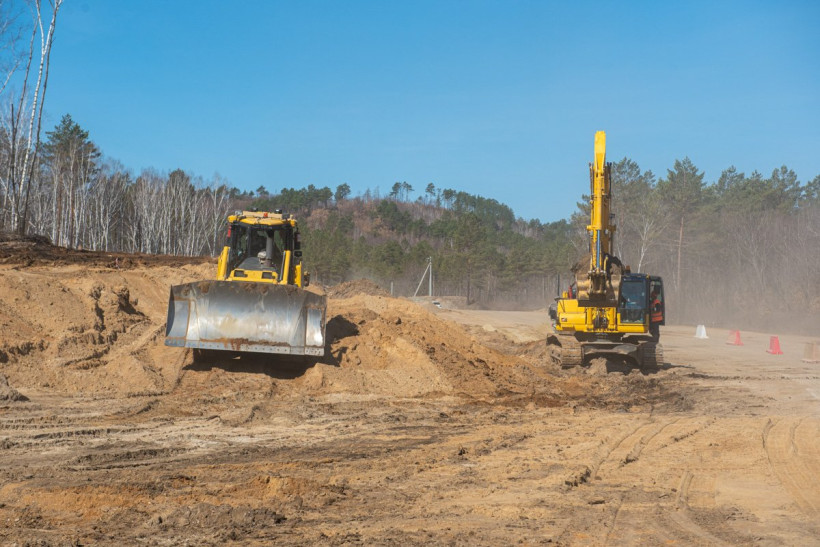 Сейчас строительство идет на протяжении всех пять с половиной километров. Дорожники круглые сутки укрепляют откосы, строят системы водоотведения, возводят основание будущей дороги. Техника работает и в русле водоотводных каналов, и на склонах сопок.