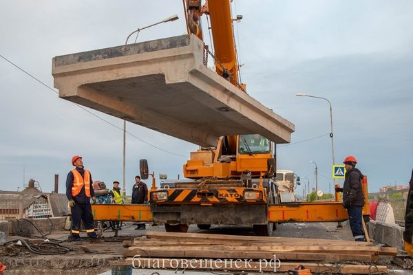Губернатор Амурской области Василий Орлов проинспектировал ремонт моста через Зею. Минувшей ночью на проблемном сооружении началась замена бетонных плит. Работы ведет компания «Мост», которая строила мост в Китай и будет возводить новый мост в Благовещенске. По информации главы региона, сквозное движение на зейском мосту планируется открыть 1 июня, а полностью завершить работы к 14 июня.