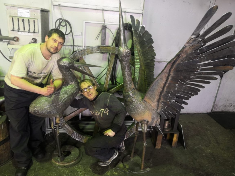 Скульптура аистов, в человеческий рост каждый — дело рук местного таланта Виктора Кузнецова и его сына, полного тезки. В композицию также войдет колесо от телеги и гнездо. Все элементы выполняются вручную из вязальной проволоки.