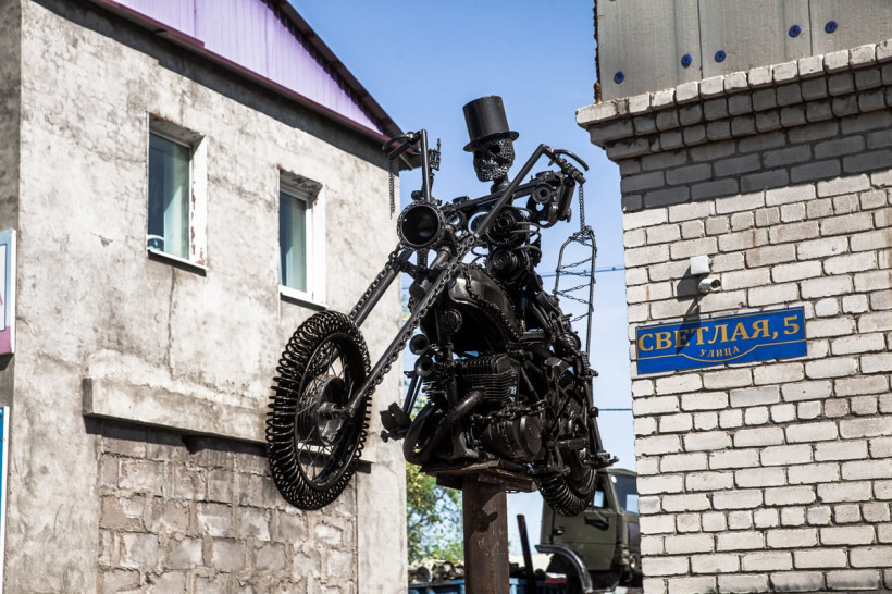 Металлический байкер на столбе высотой два метра стал достопримечательностью района Тайвань в Благовещенске. 250-килограммовая конструкция стоит возле здания мотоклуба «Пижоны». Обычно здесь немноголюдно, но с появлением железного байкера квартал оживился: фотографироваться с ним приходили горожане, далекие от байкерской субкультуры. «Амурская правда» поговорила с создателем арт-объекта Александром Карцевым и вице-президентом клуба «Пижоны» Максимом Намаконовым.