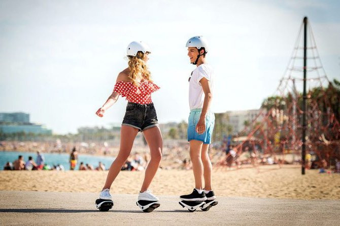 Новинка, которая еще не вошла в массы, но уже волнует любителей быстрой езды. Работает по принципу гироскутера, но на каждую ногу надевается отдельный механизм. На некоторых моделях индикаторы позволяют роликам менять цвет под обувь человека, и не выделяются. Развивает скорость до 12 км/ч. Правда, долго кататься на электророликах не получится. Максимальная длительность заряда батареи — 45 минут. Гаджет подойдет практически любому спортсмену, так как выдерживает вес до 100 кг.