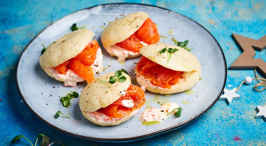 Для булочек смешайте все сухие ингредиенты. Подогрейте молоко с маслом. Добавьте в мучную смесь. Замесите тесто и вымесите его до эластичности. Сформируйте шар из теста, смажьте его маслом, положите в чистую большую миску, затяните пленкой и поставьте в теплое место на 1,5 часа. Выложите тесто на рабочую поверхность, расплющите в пласт, равномерно посыпьте разрыхлителем и вымесите, 3–4 минуты. Затем скатайте из теста колбаску и разрежьте на кусочки весом примерно 35 г. Скатайте каждую часть в аккуратный шарик, затем раскатайте в лепешку диаметром 7 см. Накройте полотенцем и дайте расстояться, 30–40 минут. Подготовьте пароварку. Проложите пергаментом и партиями готовьте булочки на пару, примерно по 12 минут. Для соуса смешайте сметану с лимонным соком по вкусу и икрой, приправьте перцем. Теплые булочки надрежьте пополам, промажьте икорным соусом, положите по паре ломтиков лосося и подавайте.