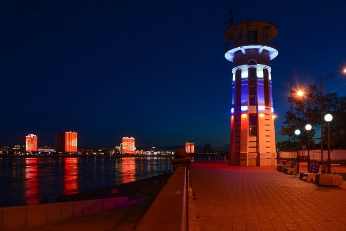На пограничной вышке на набережной Благовещенска в районе улицы Мухина, 1 протестировали архитектурную подсветку в виде триколора. Она появилась на фасаде специально ко Дню России. В три яруса были установлены светодиодные архитектурные светильники – всего 24 штуки.