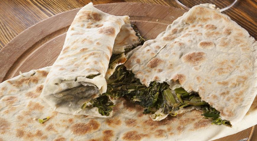 Муку перемешиваем с мацони (можно заменить на сметану или белый йогурт) и солью, добавляем воду. Оставляем отдыхать на 30 минут. Начинка готовится отдельно из крупно нарезанной зелени с добавлением небольшого количества растительного подсолнечного масла. Соль, перец по вкусу. Раскатываем тесто (60 г) в виде овала. Накладываем начинку на середину и соединяем края, слегка придавливая рукой для придания формы овала. Запекаем на каменной плите или на сковороде с обеих сторон примерно 15 минут.