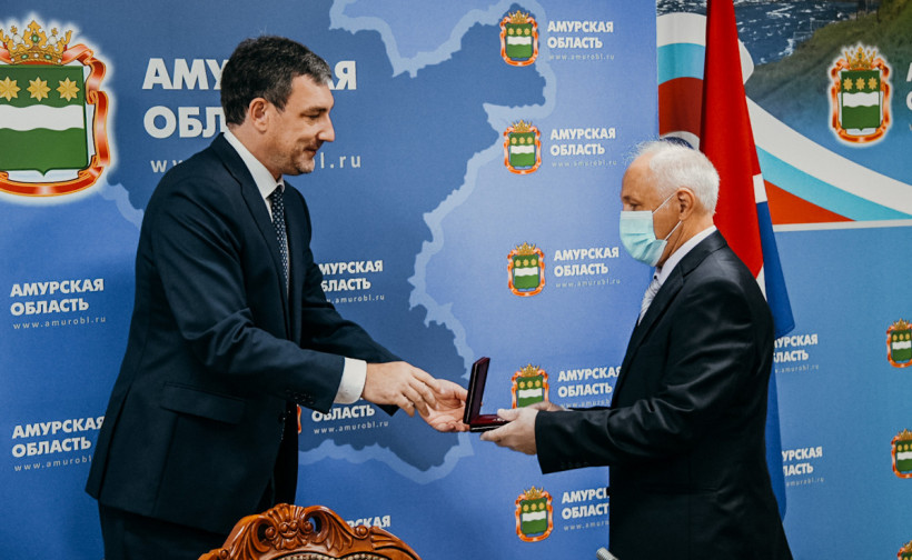 Губернатор Амурской области Василий Орлов поздравил медицинских работников с наступающим профессиональным праздником. Из-за коронавируса торжественной встречи не было: с руководителями медучреждений глава региона говорил в режиме видео-конференц-связи. В кабинет губернатора пригласили лишь врача областной детской клинической больницы Эдуарда Герценбергера. Ему Василий Орлов вручил госнаграду — указом президента Эдуард Карлович признан заслуженным врачом страны.