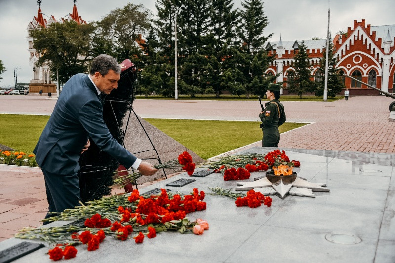 После прохождение по площади под звуки марша роты почетного караула губернатор Амурской области Василий Орлов возложил цветы к памятникам погибшим воинам-амурцам и труженикам тыла 1941—1945 гг.