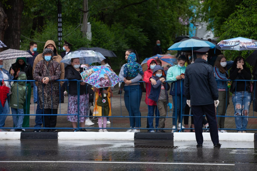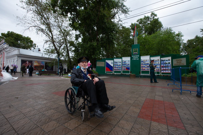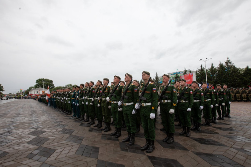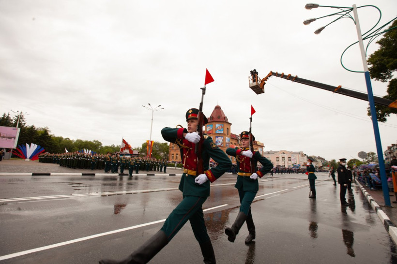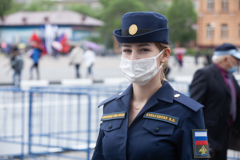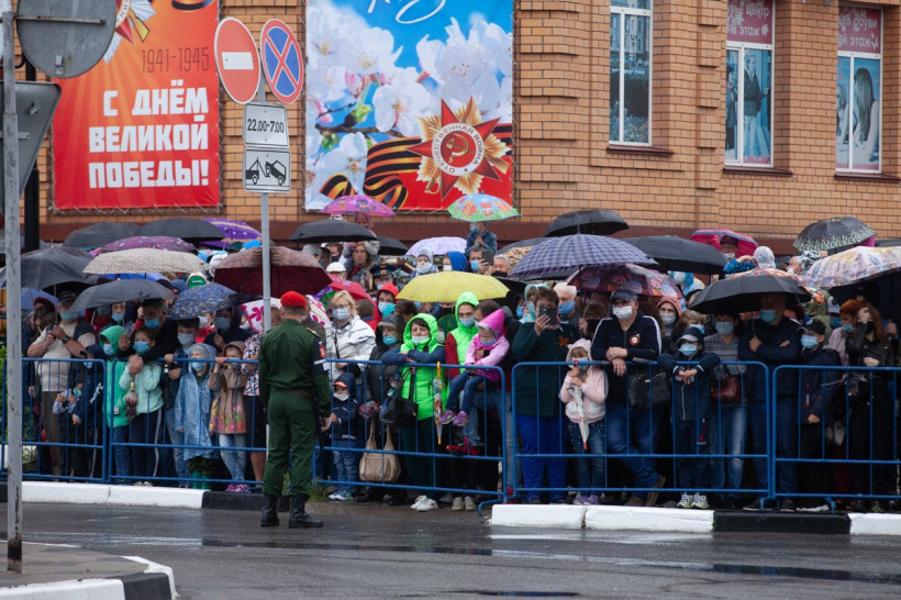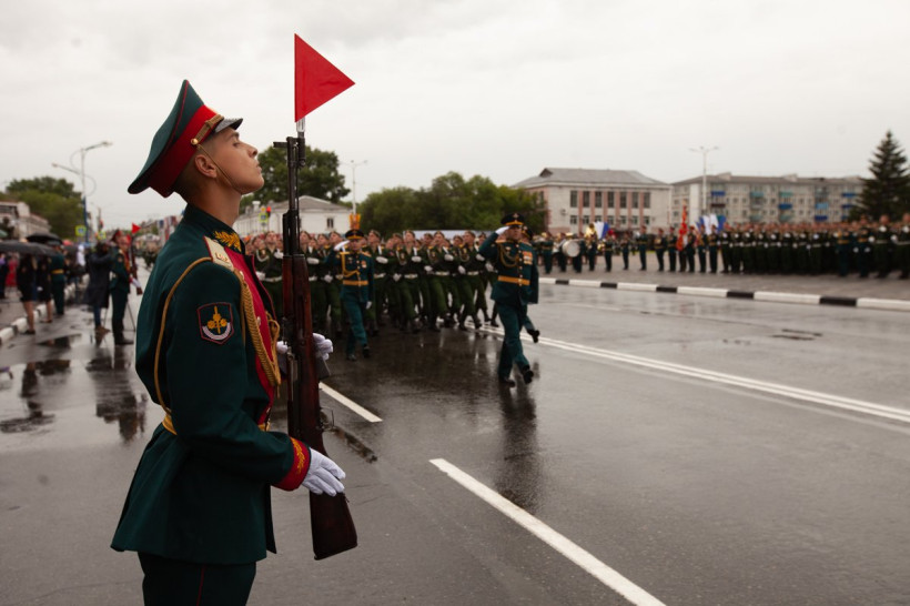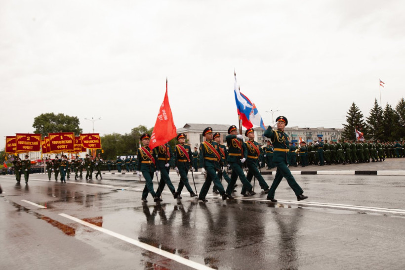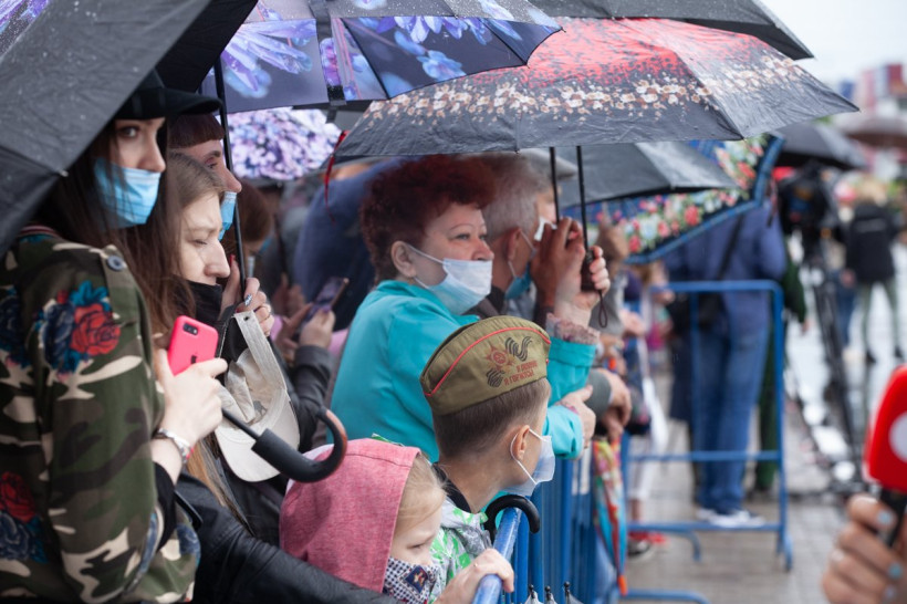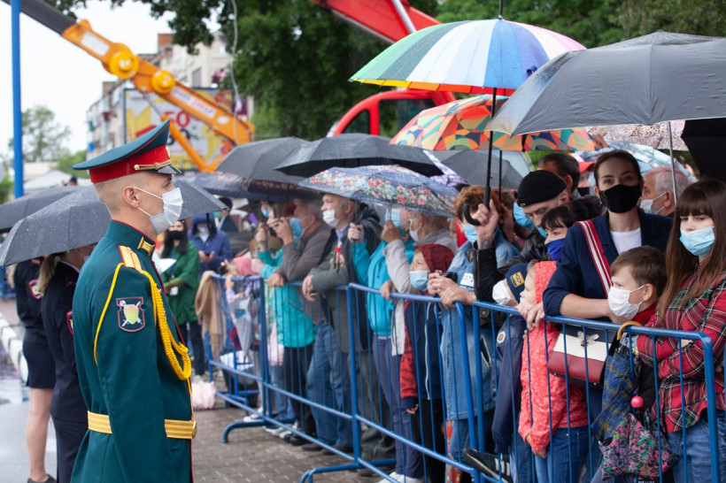 С 7 до 11 часов закрыли въезд в Белогорск для иногородних, за несколько часов провели дезинфекцию площади, зрители могли присутствовать только в масках, а волонтеры измеряли температуру тем, кто смотрел за парадом с трибуны. На торжественном, а порой и трогательном мероприятии побывали и журналисты «Амурской правды».