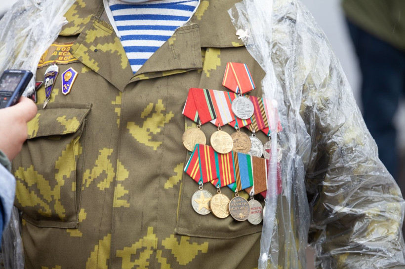 Все зрители, пришедшие посмотреть на военную мощь, были в масках. Девушки-волонтеры измеряют температуру у тех, кто будет смотреть парад возле трибуны. Без проблем прошел эту процедуру участник боевых действий в Афганистане Владимир Андреевич Болдырев.