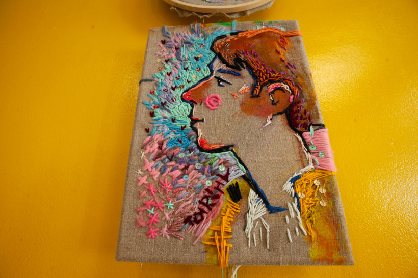 Курс современной вышивки Анна прошла онлайн, пока ее выставка и вся страна находились в изоляции. Художница впервые показала пять оригинальных вышитых работ своего авторства — таких же самобытных, ярких и позитивных, как и все ее творчество. Даже замысловатое название выставки оказалось связано с вышивкой.