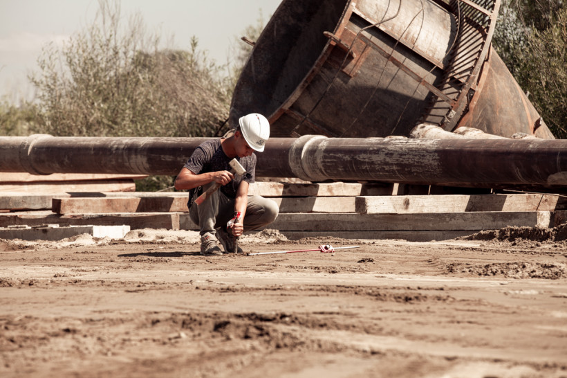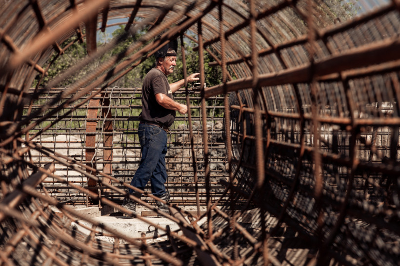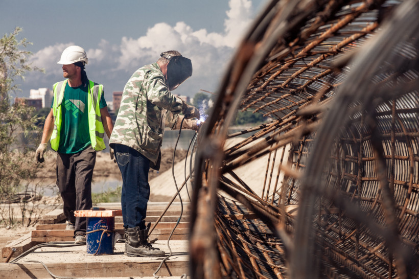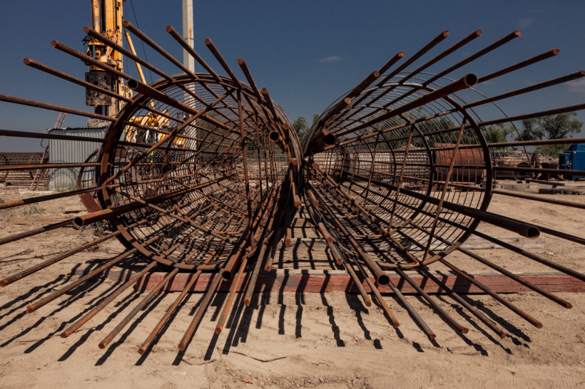 Арматурные каркасы, длина которых достигает 26 метров, варят тут же. По слвоам Павла Викторовича, работа идет круглосуточно. Причем задачи дневной и ночной смен не отличаются. За исключением того, что из-за жары заливку бетона приходится вести только в ночь.