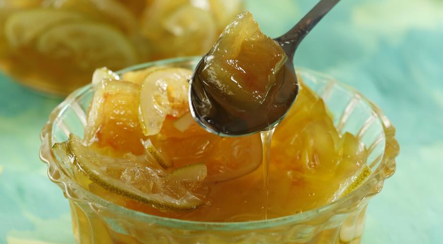 Доведите смесь до комнатной температуры, переложите в таз для варки варенья. На сильном огне доведите до кипения, уменьшите его до минимума, снимите пену, варите 25 мин. Снимите с огня, остудите в течение 3 ч, снова доведите до кипения, варите 10–15 мин. Разложите по стерилизованным банкам и закройте.