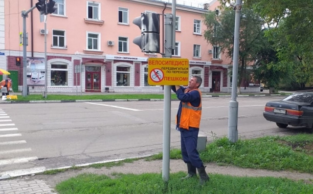 В Благовещенске на пересечении улиц Ленина и Театральной появились предупреждающие таблички для велосипедистов. Они напоминают, что для передвижения по пешеходному переходу нужно спешиться. На следующей неделе подобными табличками оборудуют еще 4 перекрестка.