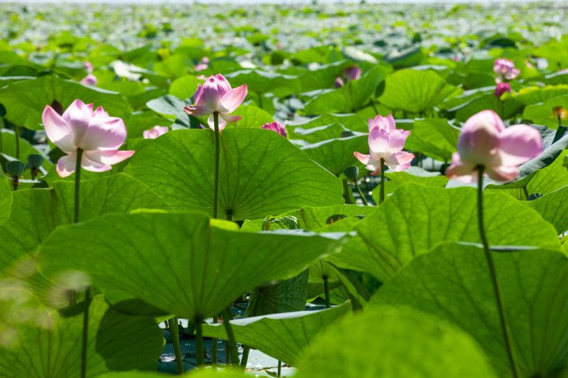 Но встреча того стоит. Лотосы практически сплошь покрывают водную гладь, причем диаметр листьев в среднем — 40—50 сантиметров. Отдельные экземпляры достигают и метра. Сами цветы не только распускаются прямо на водной глади: некоторые поднимаются с помощью черенков на расстояние 20—30 сантиметров над озером. В целом эти растения занимают всего 5 процентов озера, но, учитывая размеры Долгого, плантация лотосов выглядит внушительно и невероятно красиво. Цветет это растение несколько недель: с середины июля до середины августа.