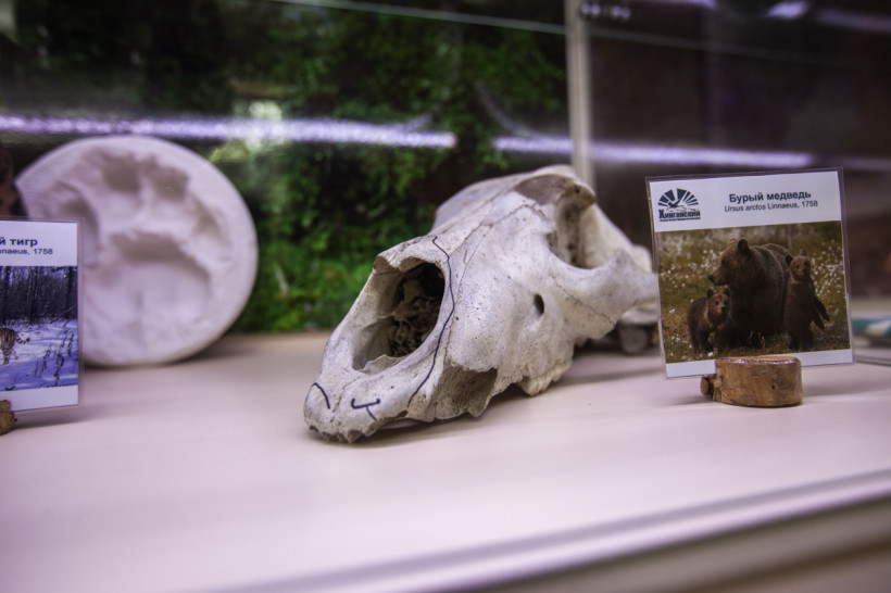 Первый стенд, который привлекает внимание, — это несколько полок с черепами различных животных. Самыми внушительными выглядят черепа кабана с клыками и косули с рогами. Есть и небольшие экспонаты размером с грецкий орех: например, азиатского бурундука и даурского хомяка. Также на стендах расположены черепа волка, рыси и других зверей. Возле каждого — фото с названием и краткой информацией о животном.