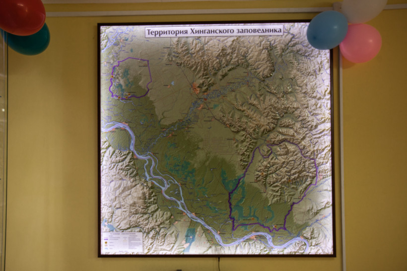 Экспозиция начинается с настенной карты Хинганского заповедника. Здесь вам расскажут о том, какие виды птиц и животных обитают в разных районах территории, где находится станция реинтродукции редких видов птиц, где живет амурская тигрица Илона и как проехать на озеро Долгое, где каждое лето расцветают лотосы Комарова.