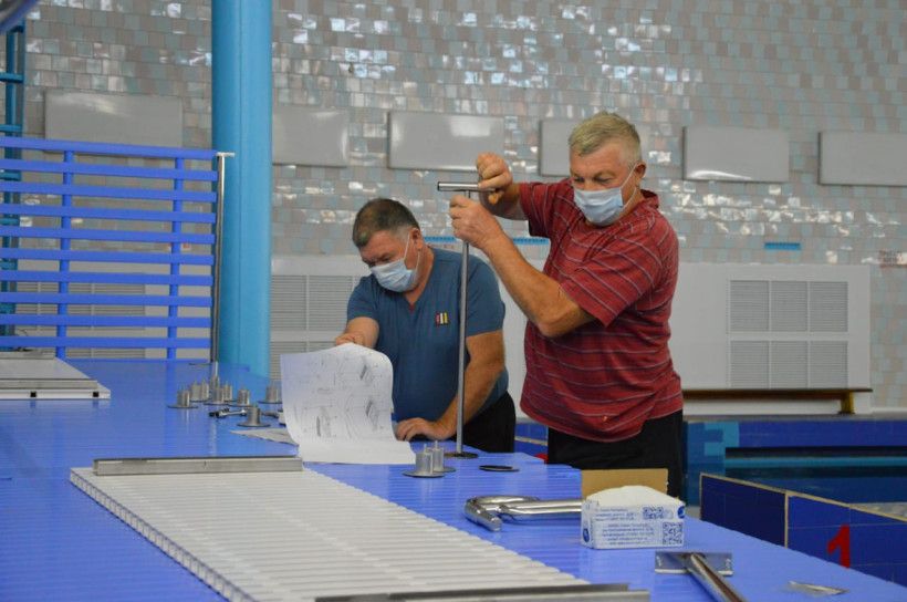 Второе дно представляет собой съемную чашу 3 на 8 метров и глубиной в 70 сантиметров – с поручнями и бортиками для безопасного плавания. Конструкция будет установлена на опорах на дно основной чаши и займет часть одной из дорожек. Сейчас оборудование собирают в тестовом режиме.
