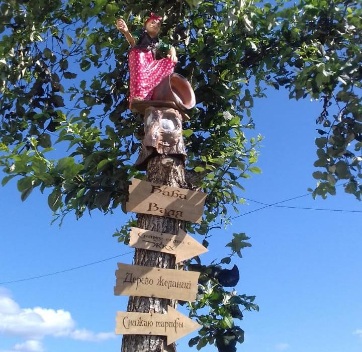 Учредитель объяснил: фигурки аистов и Бабы Яги для дерева он выбрал потому, что похожие украшения стоят возле его дома. Таблички прикрутили на шурупы, а для фигурок сделали специальную фиксирующую конструкцию.