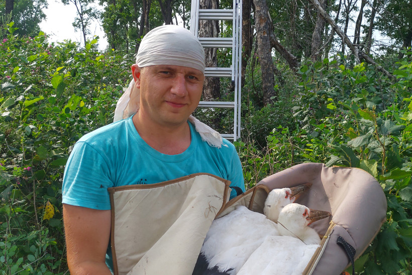 — В этом году планировал пометить 35 аистят GPS-передатчиками. Но из-за коронавируса передатчики не смогли привезти из Китая — граница закрыта. У меня с прошлого года остались два, вот сейчас их и поставлю, — говорит Антон Сасин.
