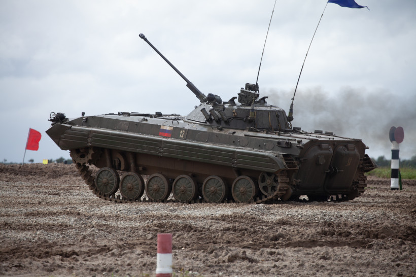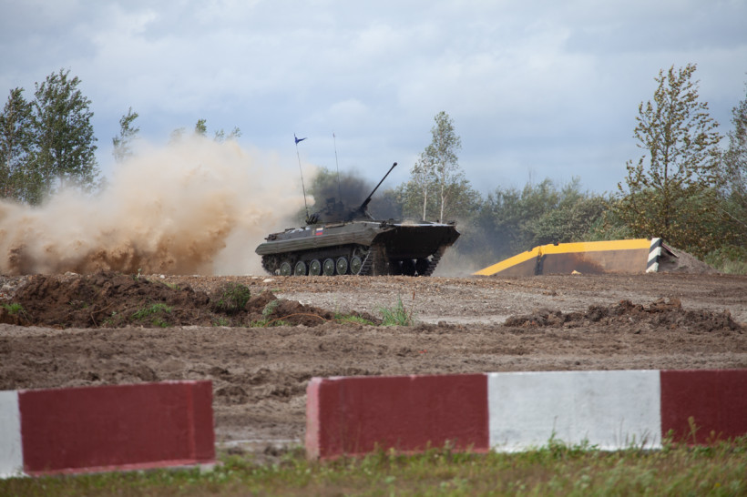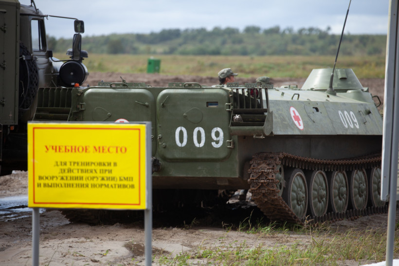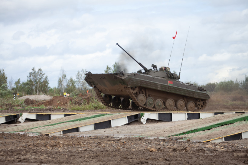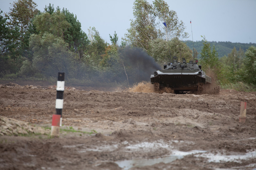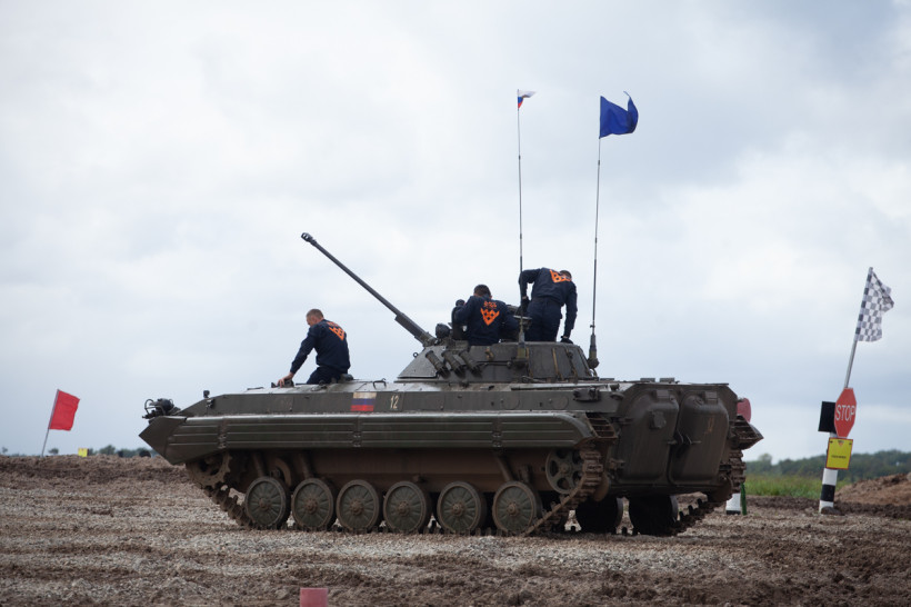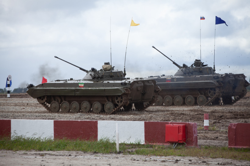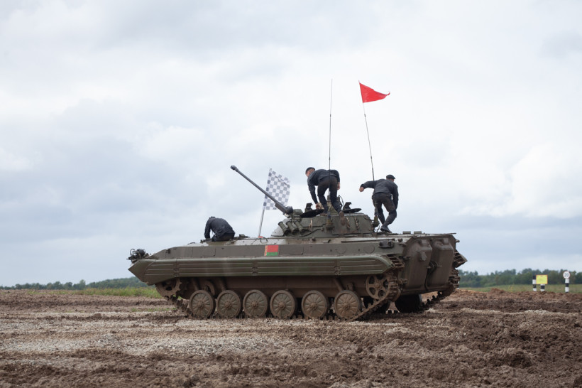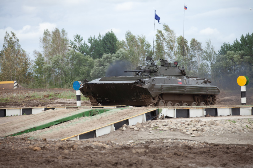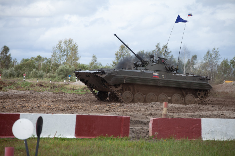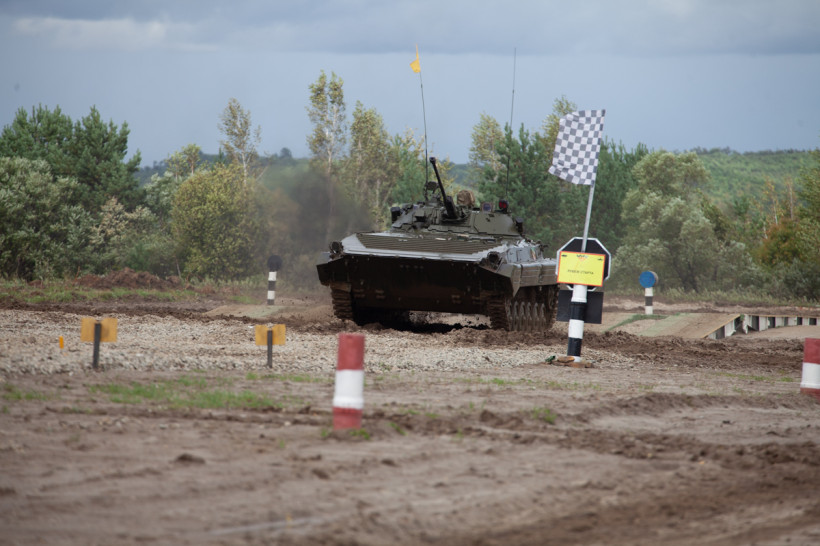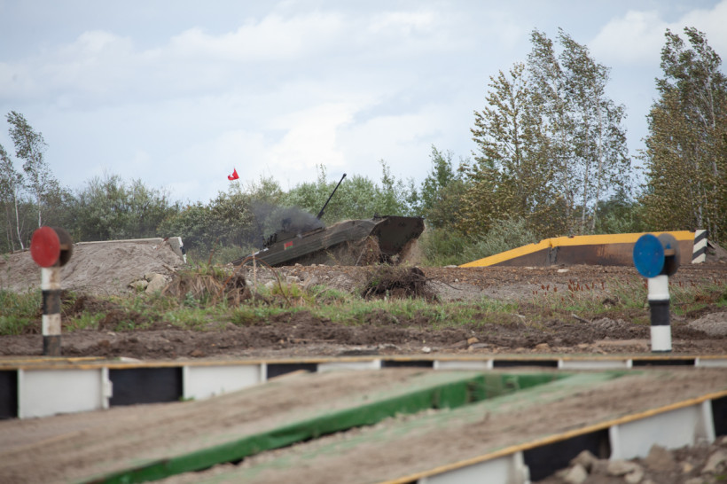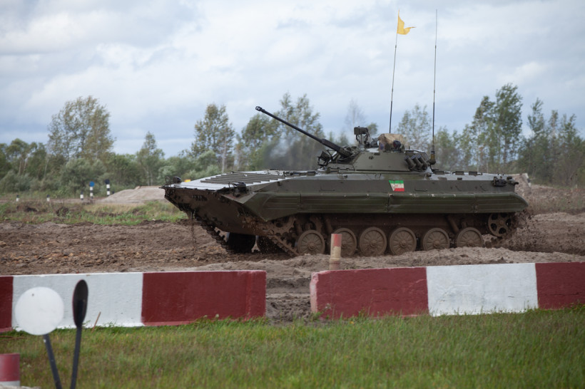 Уже на первых кругах россияне (БМП-2 под синим флажком) вырвались вперед. На второй позиции с трудом удерживались белорусы, а вот иранцы старались, но никак не могли «выехать» с третьего места.