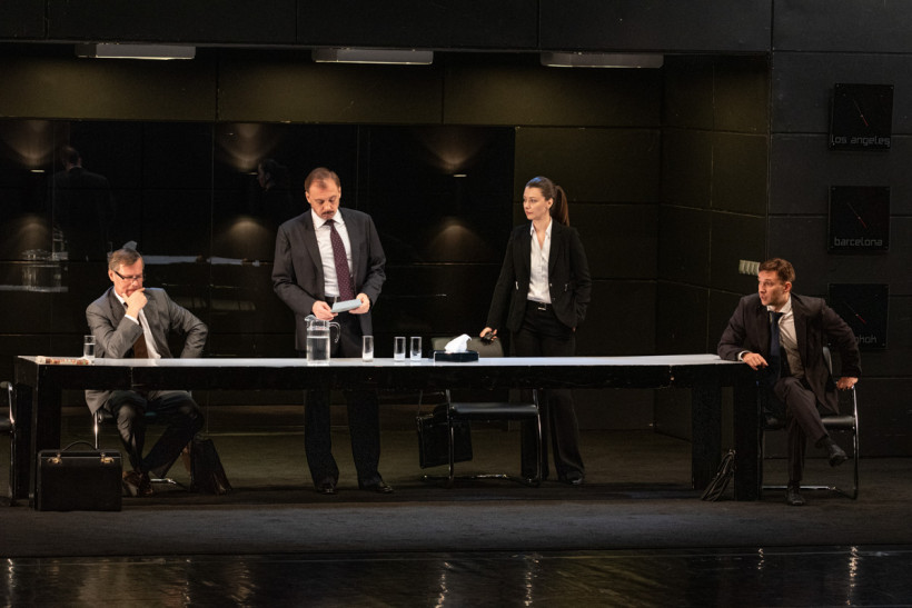 На сцене большого зала ОКЦ — стильный серый кабинет с большим столом для переговоров, приглушённый свет, мягкие кресла — такие есть в каждом офисе уважающей себя компании (это реальные декорации, которые доставили фурами из Москвы. — Прим.АП). Вот только огромная формалиновая акула над столом немного выбивается из строгого дизайна. Но в пьесе испанского драматурга Жорди Гальсерана и одноименном спектакле нет ничего случайного. Ведь в ближайшие два часа герои будут жить по законам животного мира — сильные попытаются сожрать слабых.