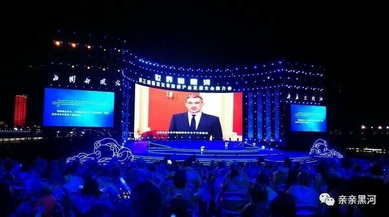 Церемония открытия стала самым зрелищным событием конференции. В масштабном шоу на огромной сцене принимали участие несколько сотен актеров, а по Амуру вдоль берега курсировали подсвеченные корабли и лодки. Самым запоминающимся стало представление волонтеров на велотренажерах. Они находились на китайской части пограничного моста через Амур и символично отметили предстоящий запуск движения, проехав расстояние, эквивалентное длине самого моста. «Мероприятие завершилось одновременным салютом с китайской и российской сторон», — сообщает пресс-служба правительства Амурской области.