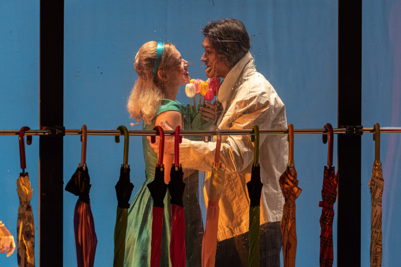 Актеры театра очень точно передают на сцене эмоции расстроенных героев. Во время трогательной сцены в кинотеатре влюбленные сеанс за сеансом сидят, держась за руки. Вместе с ними проживаешь всю боль отчаяния из-за невозможности что-то изменить. «Я тебя укрою от любой беды, у меня есть на свете лишь ты», — печалится Женевьева. «Мне никто не нужен, только ты одна», — вторит ей Ги. Абсолютно весь спектакль поется, любая, даже самая короткая фраза, звучит нараспев.