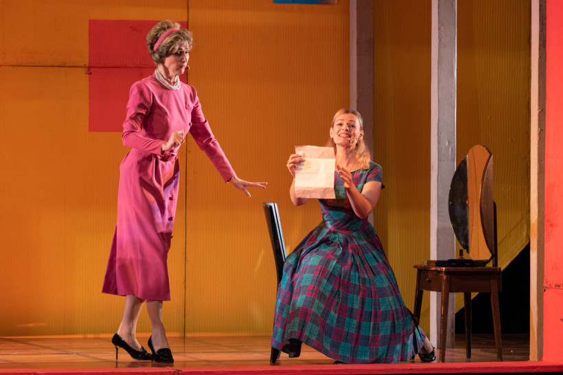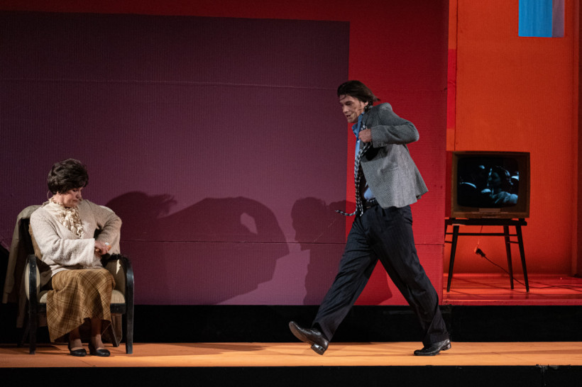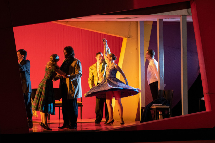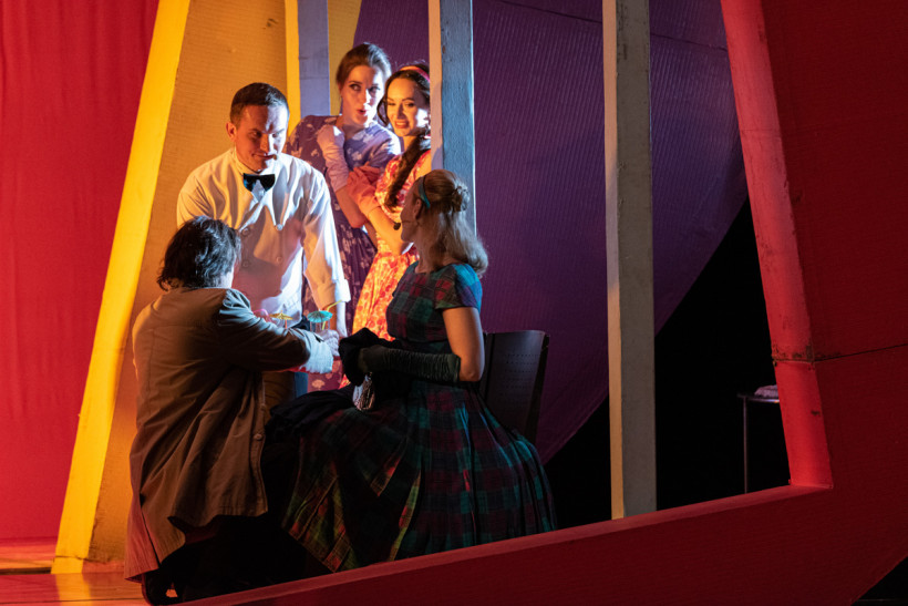 Первый, ближний к зрителю, огромный малиновый круг с прорезями в форме окон и дверей словно кадрирует прямоугольными очертаниями спектакль. Временами кажется, что это меняющиеся слайды диафильма с живой поющей картинкой.