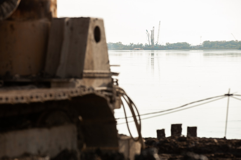 Всего на левом берегу вбили уже 32 сваи, на правом — две. При этом на протяжении мостового перехода свай будет больше трех сотен. Сойдутся две стороны моста, правый и левый берега, примерно на середине реки.