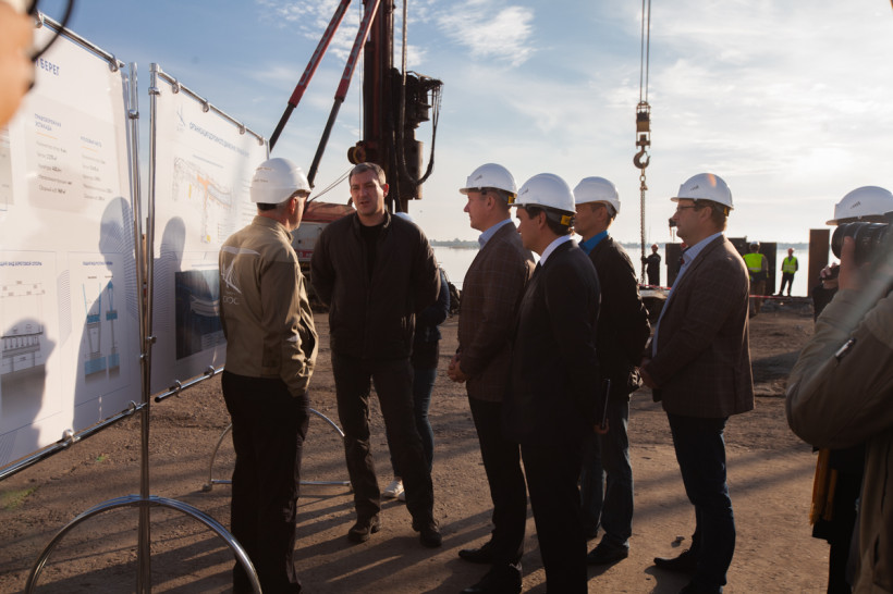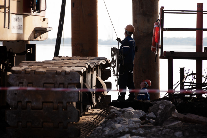 — Сейчас на правом берегу ведутся работы на первой русловой опоре — номер шесть. Первую скважину для нее уже забетонировали. Тут у нас буровая установка и мы бурим сейчас скважину номер два, на сегодня запланировано ее бетонирование, — пояснил губернатору, преодолевая гул строительных машин, Эдуард Давыдов.